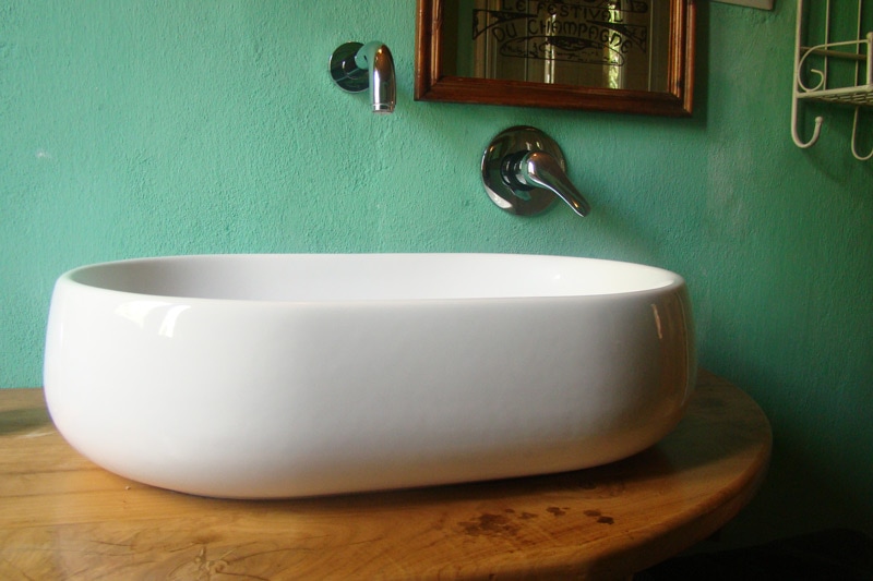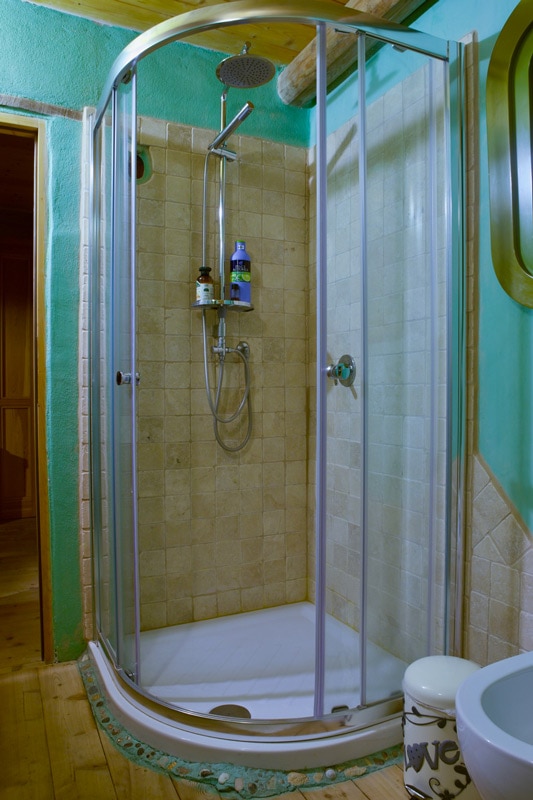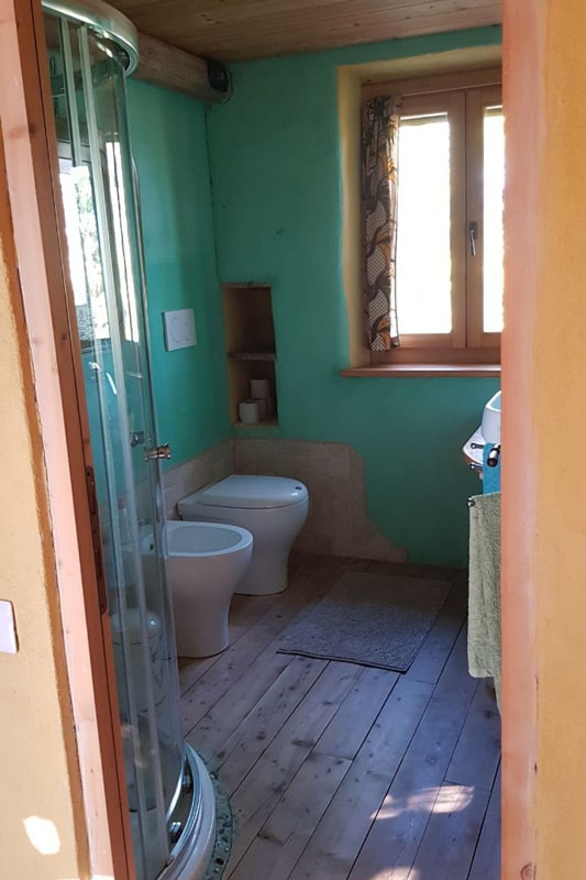 Il bagno, ampio e privato, pavimento in legno, bidet e doccia.