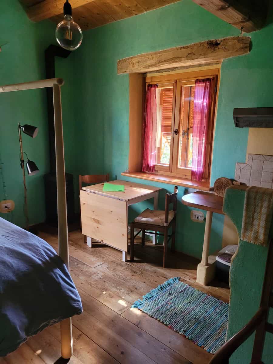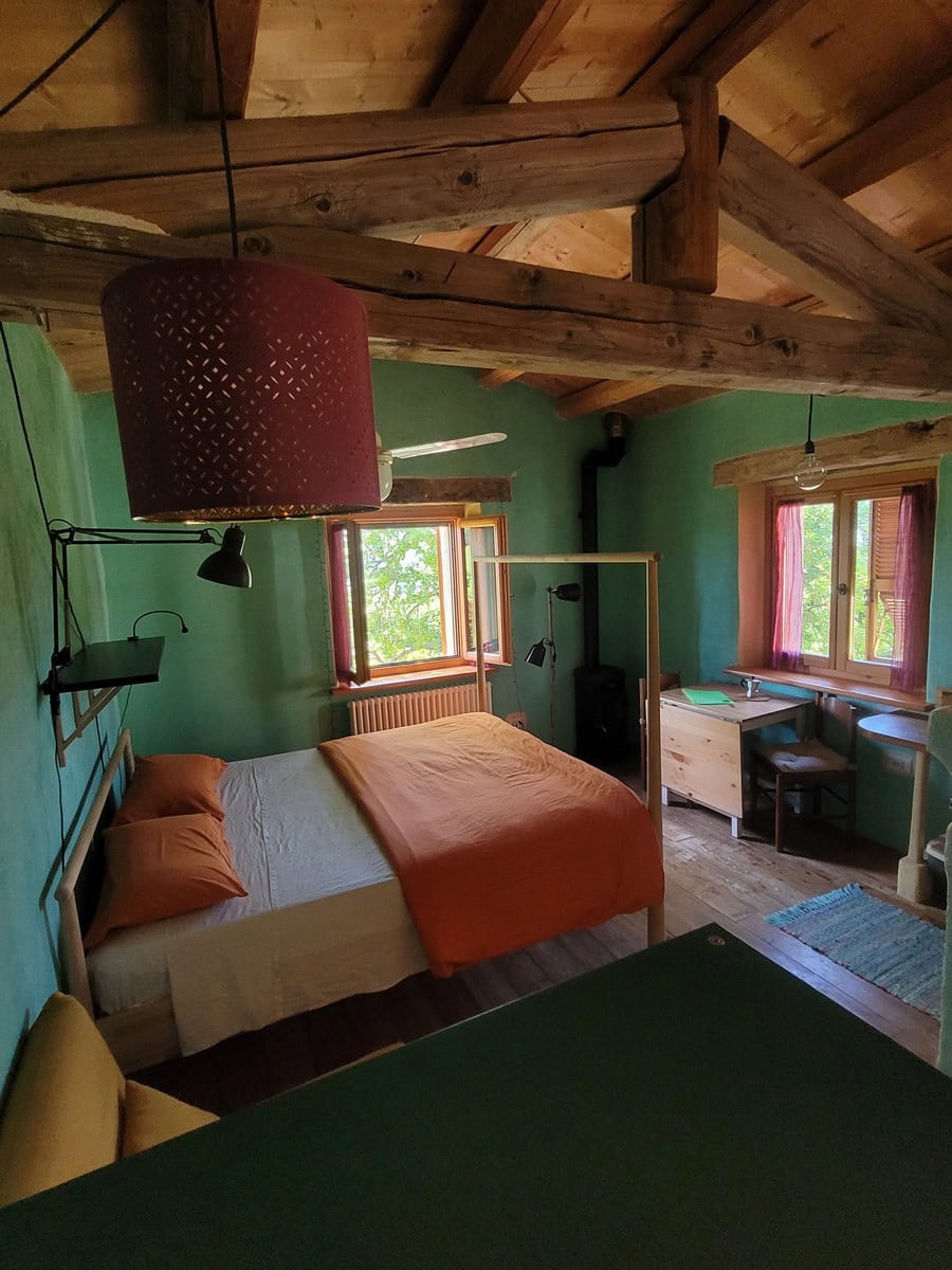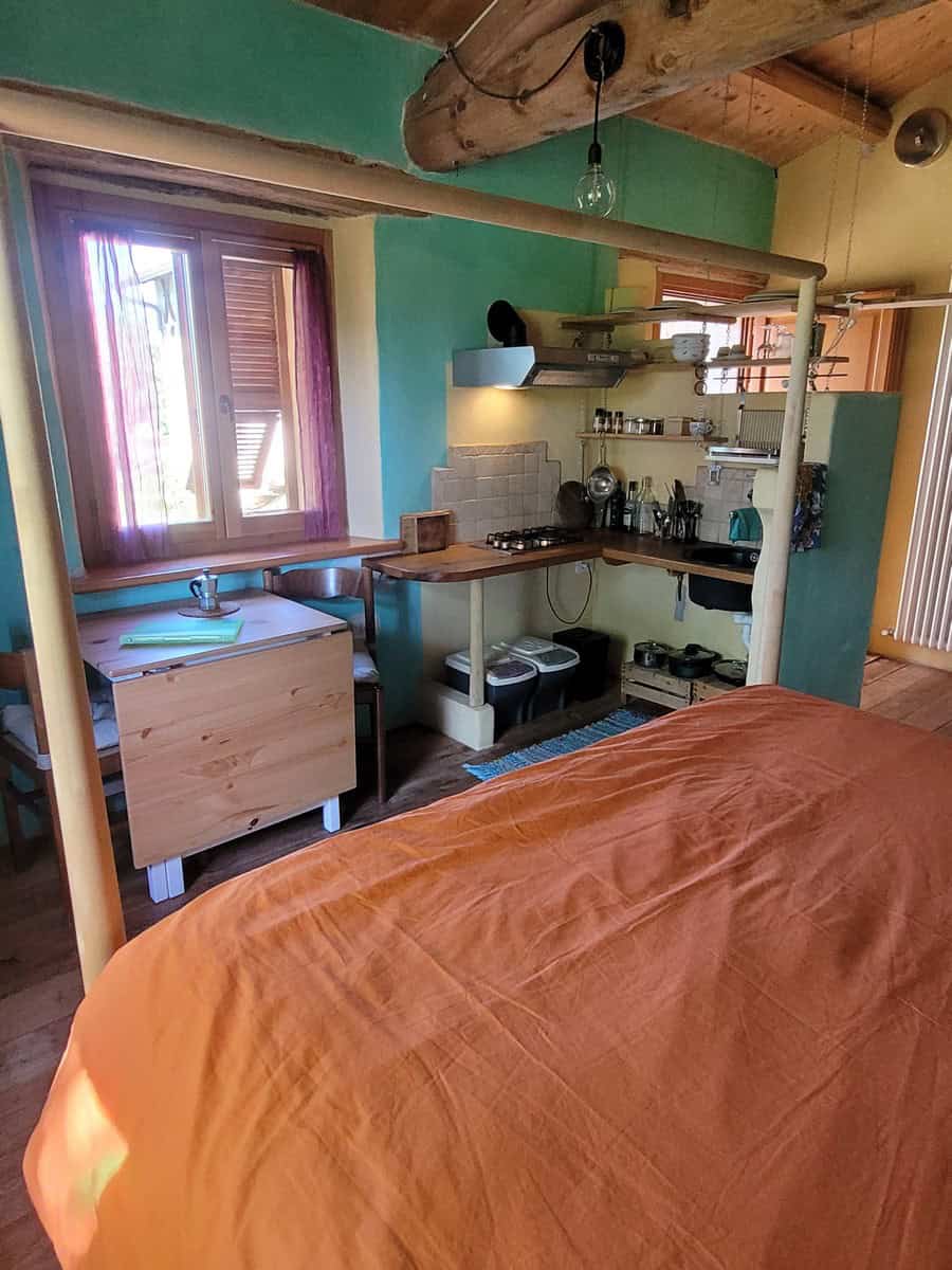 Scopri la “Casetta Verde”, il tuo rifugio perfetto dove ogni dettaglio è studiato per garantirti momenti di relax e intimità. Questo spazio accogliente combina in un unico ambiente un gran letto, un confortevole divano, un pratico angolo cottura e un tavolo da pranzo con due sedie. Adiacente, troverai un bagno spazioso. La finestra offre una vista mozzafiato sulle sinuose colline e su una delle querce più grandi che tu abbia mai visto. E per le serate più fresche, una stufa a legna con focolare a vista crea l’atmosfera ideale.